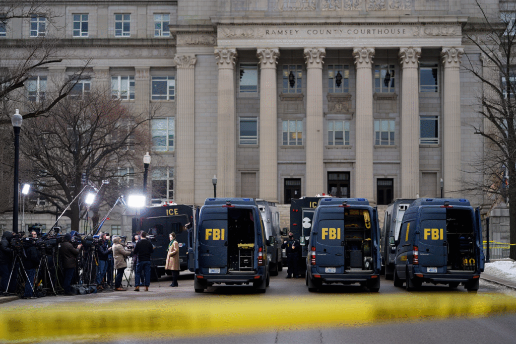 The raids reportedly took place at multiple locations throughout Minnesota, including offices, residential properties, and businesses believed to be connected to the alleged operation. Law enforcement vehicles and federal agents were seen securing several sites as investigators collected documents, digital devices, and other potential evidence.